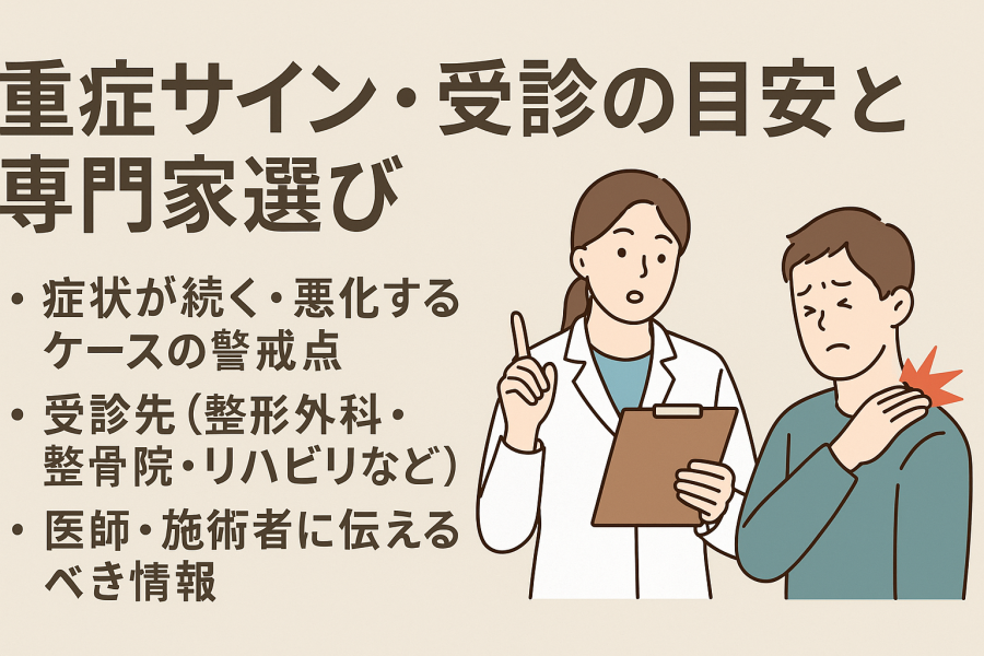 このような症状が続く場合は、セルフケアだけで様子を見るのではなく、専門家による姿勢チェックや触診を受けることが望ましいとされています。