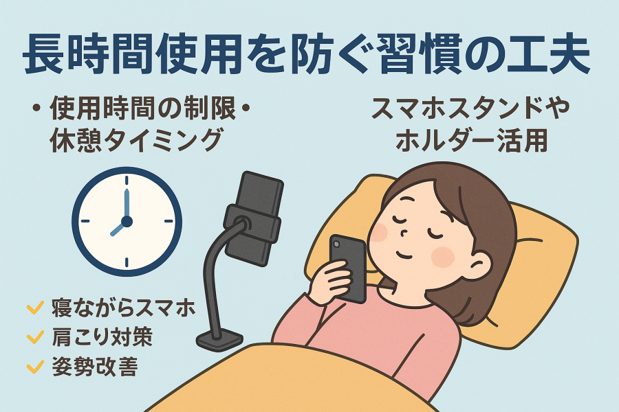 スマホの長時間使用は、肩や首への負担を増やす原因のひとつといわれています。特に「寝ながらスマホ」を続けると、姿勢の歪みや筋肉のこりを悪化させやすいと考えられています。ここでは、無理なく続けられる使用時間のコントロール方法と、便利なアイテムを使った習慣改善法を紹介します。