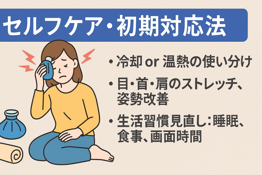 冷却や温熱のケア、ストレッチや姿勢の調整、生活習慣の改善などはすぐに始められるセルフケアの一つです。痛みの性質を観察しながら、自分に合った対応を試みることが、症状の軽減に役立つと言われています。