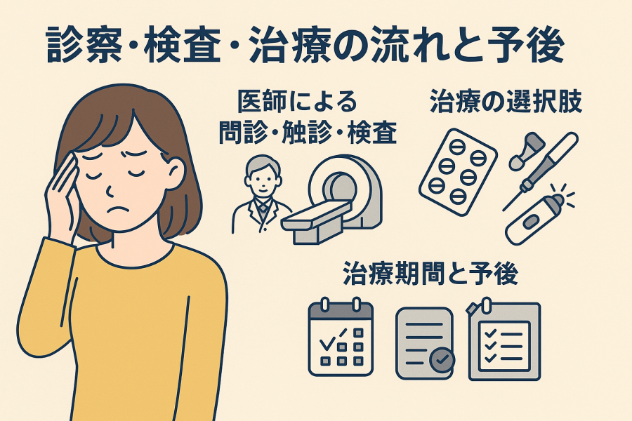左こめかみの頭痛が続くとき、医療機関での診察が必要になることがあります。ここでは、来院時の一般的な流れと治療の選択肢、さらに予後について整理してみましょう。