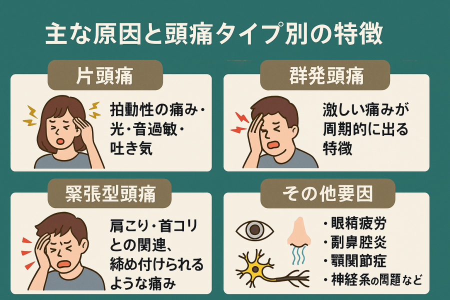 左こめかみの頭痛にはいくつかのタイプがあり、それぞれ特徴や原因が異なると言われています。ここでは代表的な頭痛の種類を整理しながら、その特徴を解説します。