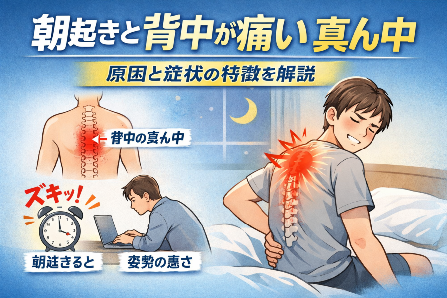 といった表現です。これは、睡眠中に同じ姿勢が続き、筋肉や筋膜が一時的にこわばるためと考えられています。また、日中の猫背姿勢やデスクワークが続くと、背中の真ん中に負担がたまりやすいとも言われています。