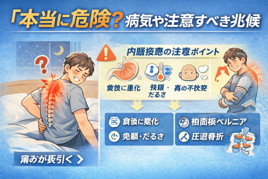 こう聞かれること、正直かなり多いです。多くは生活習慣が関係すると言われていますが、痛みが長引く・夜中でも目が覚めるほど痛い・手足のしびれが出る・体重が意図せず減るといったサインがある場合は注意が必要とされています。