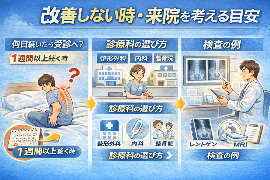 「朝だけじゃなく、日中も気になる」「休んでもスッとしない」など、いつもと違う感覚が続くときは、無理に我慢しないほうが安心、という考え方です。診療科の選び方(整形外科/内科/整骨院など)