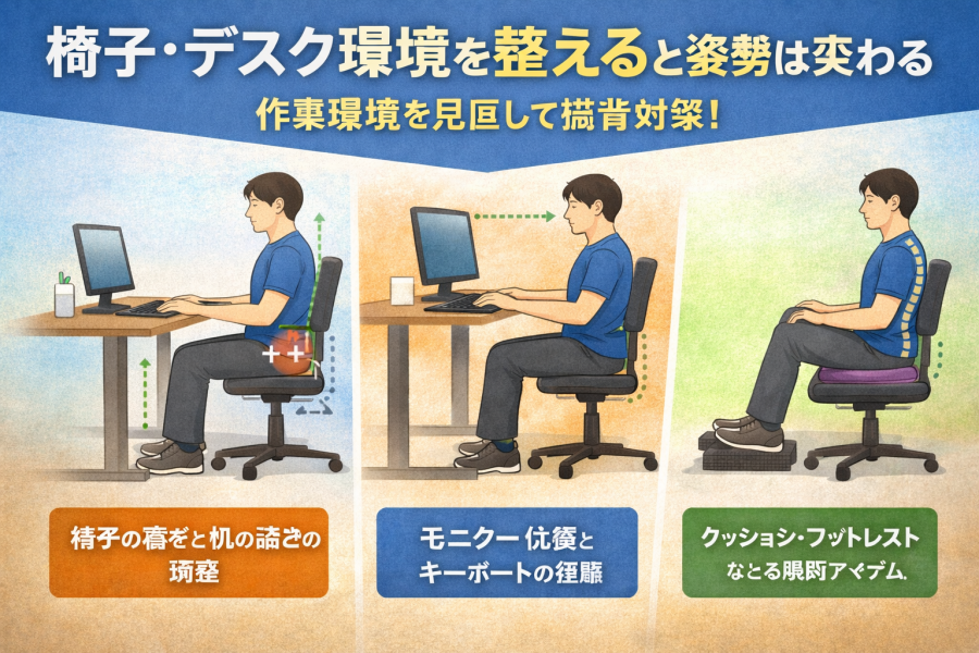 そんな方も多いですが、椅子・机・モニターの位置を調整するだけでも、姿勢は保ちやすくなると言われています。ここでは、猫背になりにくい作業環境のポイントを整理していきます。