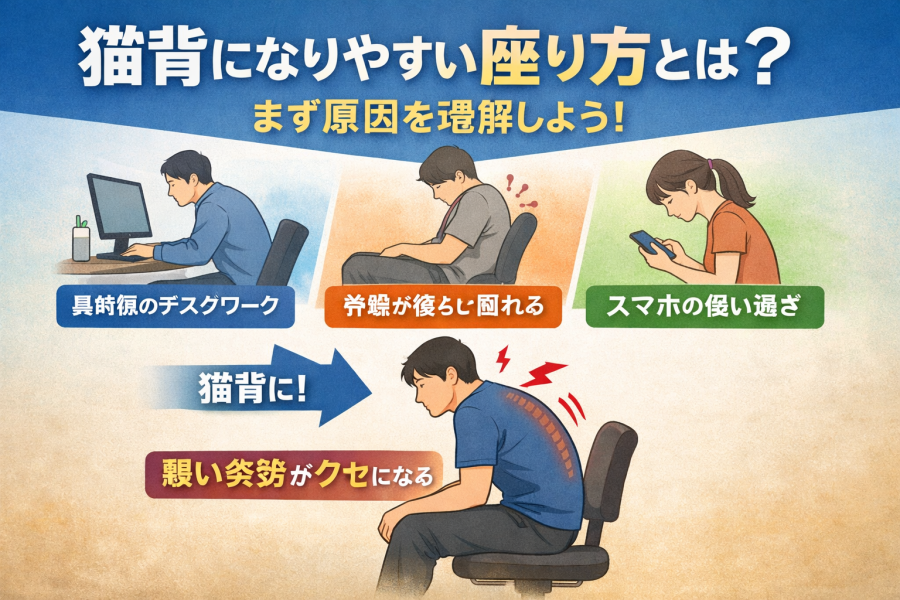 こうした状況が積み重なることで、猫背の座り方がクセになりやすいと言われています。