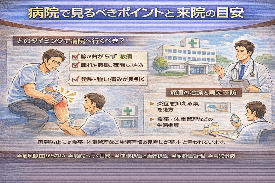 痛風による痛み・動かしにくさがある場合、どのタイミングで病院(整形外科・内科)へ行くべきか、検査内容や治療の選択肢について整理します: