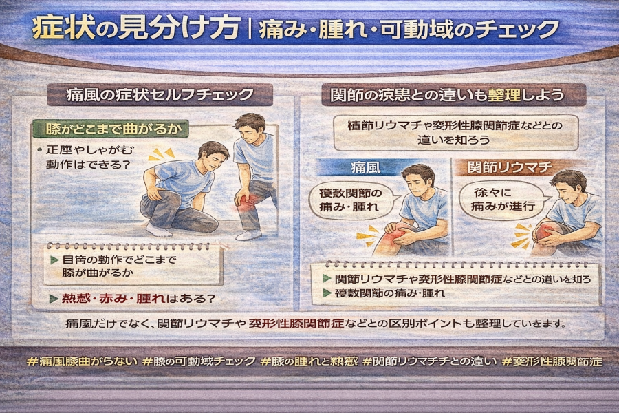 痛風だけでなく、関節リウマチや変形性膝関節症などとの区別ポイントも整理していきます。