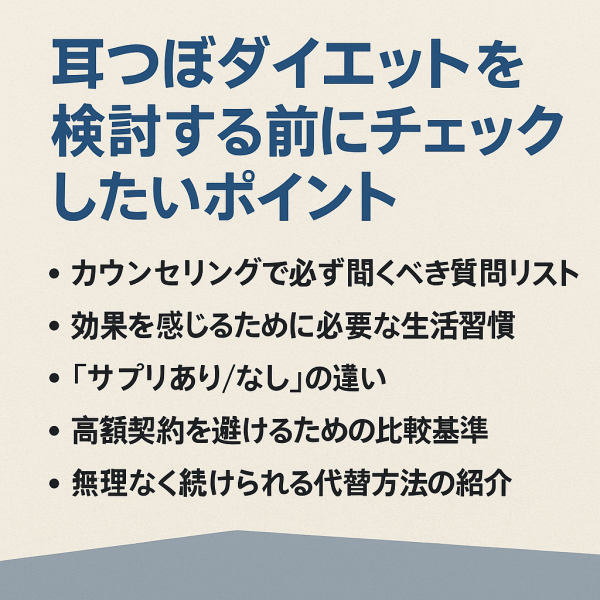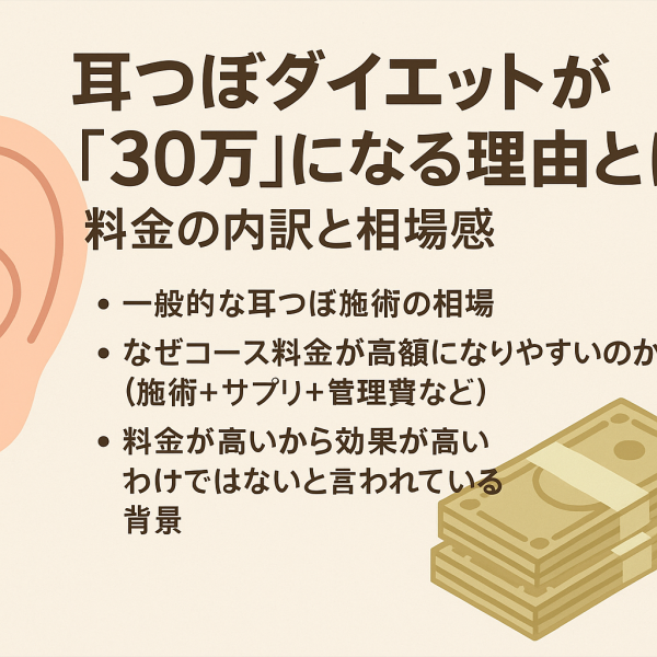 耳つぼダイエットは“数ヶ月のコース契約+サプリ代”がセットになるケースも多く、総額が想像以上にふくらむことがあるため、一度冷静に見直す時間が必要だと説明されています。