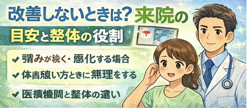 耳の後ろツボ 図を参考にセルフケアを続けても、痛みや違和感が改善しない場合は注意が必要です。特に数日から1週間以上続く場合や、悪化している場合は、一度状態を確認してもらうことがすすめられています。
