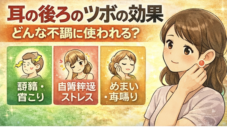 耳の後ろツボ 図で紹介される風池や完骨は、首や後頭部の筋肉と関係が深いとされています。そのため、首こりや肩こりからくる頭の重さに対して、緩和が期待できると言われています。特に長時間同じ姿勢でいる方は、このあたりの血流が滞りやすくなるため、セルフケアとして活用されることが多いです。