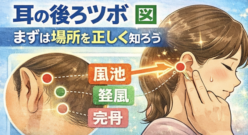 耳の後ろツボ 図を見ながら確認したい代表的なポイントが「風池」です。後頭部のくぼみ、首の付け根あたりに位置していて、押すとズーンと響く感覚が出やすい場所ですね。デスクワークやスマホ時間が長い方は、このあたりが硬くなりやすいと言われています。左右にあり、両手の親指で支えるように触れると見つけやすいですよ。