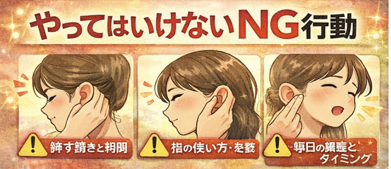 耳の後ろツボ 図を見て場所がわかると、つい強く押したくなる方も多いですが、これは注意が必要です。強すぎる刺激は筋肉や神経に負担をかける可能性があり、逆に不調を感じる原因になることもあります。あくまでやさしく刺激する意識が大切です。