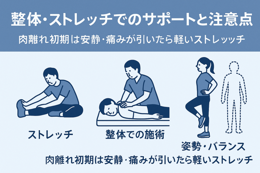 炎症や強い痛みが落ち着いてきた段階で、少しずつストレッチや整体的アプローチを取り入れるとよいと言われています。