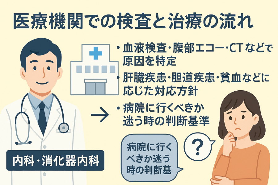肌の黄ばみが気になるとき、どの病院に行けばいいか迷う方は多いです。実際、黄ばみは肝臓や胆道、血液の状態など、さまざまな要因で起こると言われています。ここでは、医療機関での一般的な検査の流れと、来院の目安について整理してみましょう(引用元:日本内科学会順天堂大学病院)。
