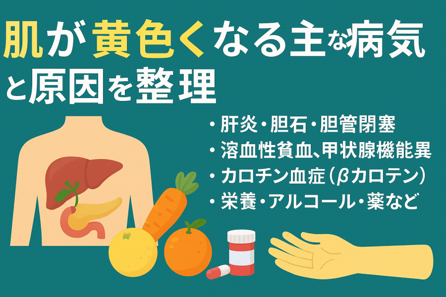 「肌の黄ばみ=肝臓」と思われがちですが、溶血性貧血や甲状腺機能異常などの血液・代謝系の疾患でも、ビリルビンの代謝が乱れ、黄疸様の症状が見られることがあると言われています。