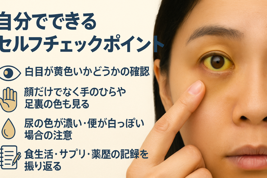 「最近、肌が黄色く見える…」と感じたとき、いきなり不安になるのではなく、まずは自分の体を観察するセルフチェックが大切です。見た目の印象だけでは照明や食事の影響で一時的に変化していることもあるため、落ち着いて確認してみましょう(引用元:国立国際医療研究センター)。