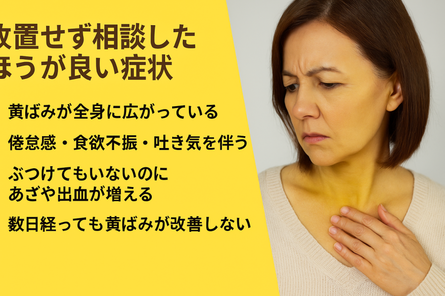 実は、肌の黄ばみが続く・広がるというのは、体の内側で起きている変化のサインかもしれません。ここでは、日本肝臓学会などで示されている一般的な注意ポイントをもとに、「放置せず相談したほうが良い症状」を整理してみましょう(引用元:日本肝臓学会)。