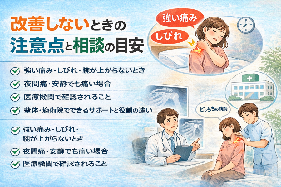 一方で、整体・施術院では、姿勢や体の使い方、首や肩まわりの緊張、寝る前後の生活習慣などを整理しながら、負担が重なりやすいポイントをみていくサポートが中心になると言われています。たとえば、枕の高さ、寝返りのしやすさ、日中の猫背姿勢などを一緒に見直すことは、肩こり 寝方の改善には役立ちやすいようです。ただし、整体は病気の有無を確認する場ではないため、強い夜間痛、しびれ、腕が明らかに上がらないなどの症状がある場合は、まず医療機関で確認する流れが安心と考えられています。そのうえで、医療と整体の役割を分けて活用していくのが現実的です。引用元:【⭐︎参考記事】および関連情報 :contentReference[oaicite:3]{index=3}