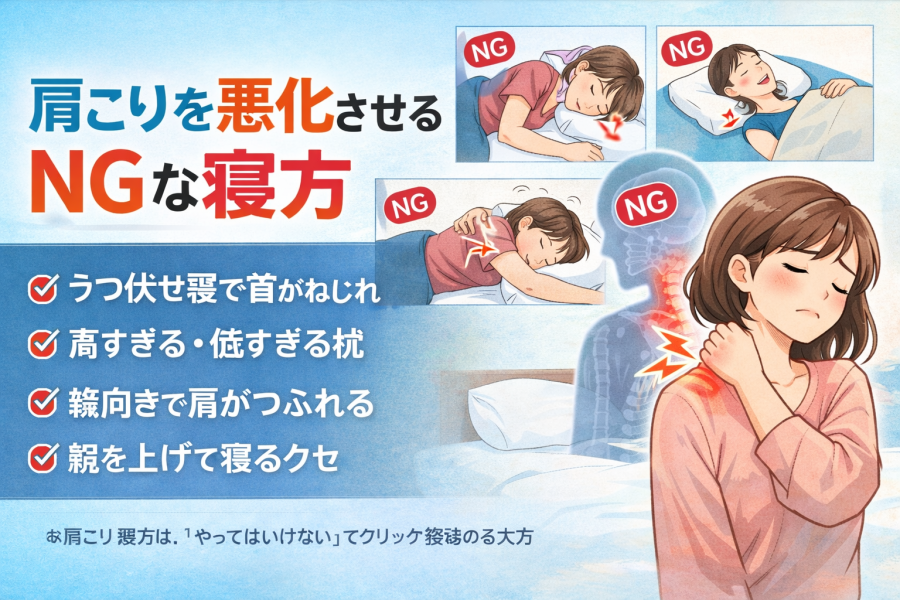 #肩こり寝方 #NGな寝方 #うつ伏せ寝に注意 #枕の高さ見直し #横向き寝と肩の負担