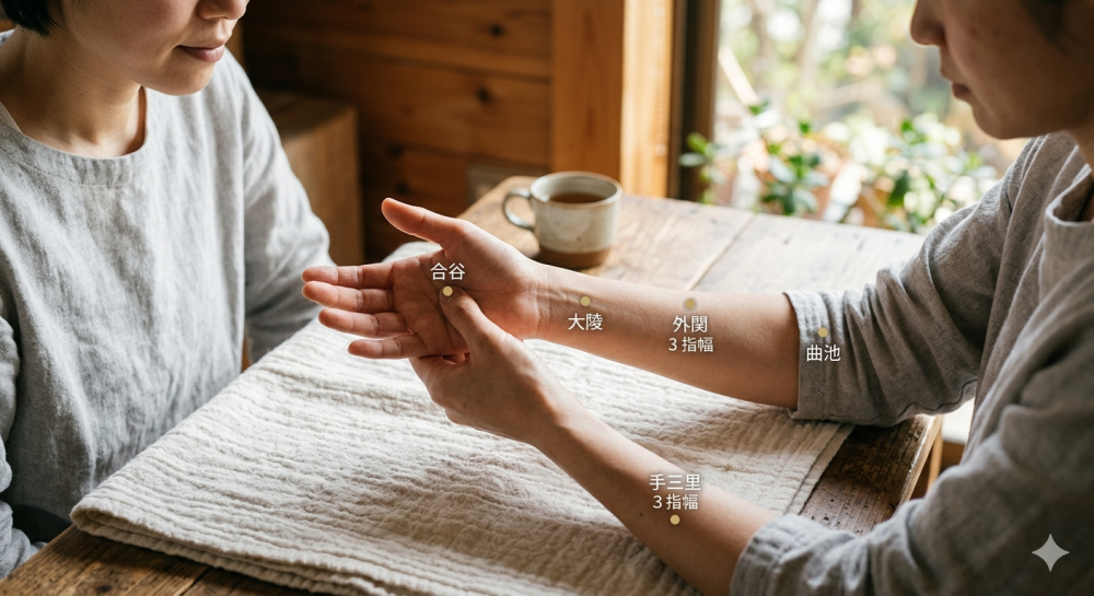 • 【外関(がいかん)】:手首の甲側に位置し、自律神経を整えながらしびれを緩和。