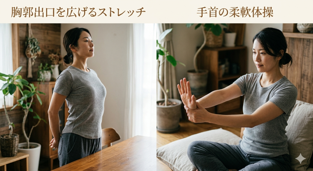 • 胸郭出口を広げるストレッチ:肩甲骨を寄せて神経の通り道を確保。