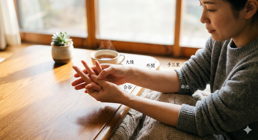 • 【曲池(きょくち)】:肘の曲げジワにある、神経の通りをスムーズにするツボ。