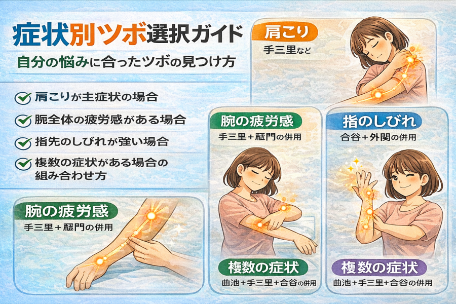 「腕のツボがいろいろあるけど、自分の症状にはどのツボが合っているの?」こういう質問をよく受けます。実は、症状によって効果的なツボが変わってくるんですよ。ここからは、症状別のツボ選択方法を紹介していきますね。