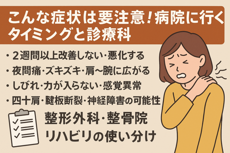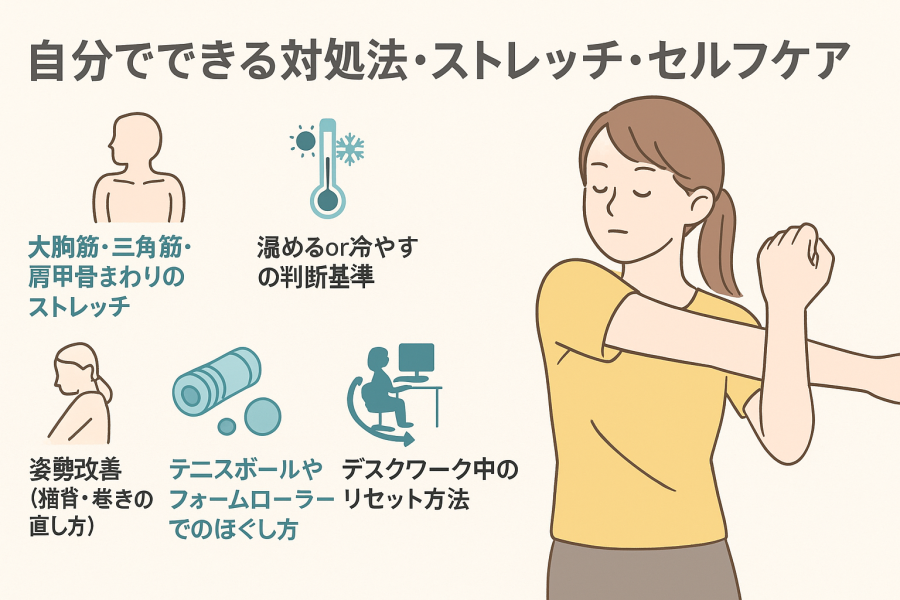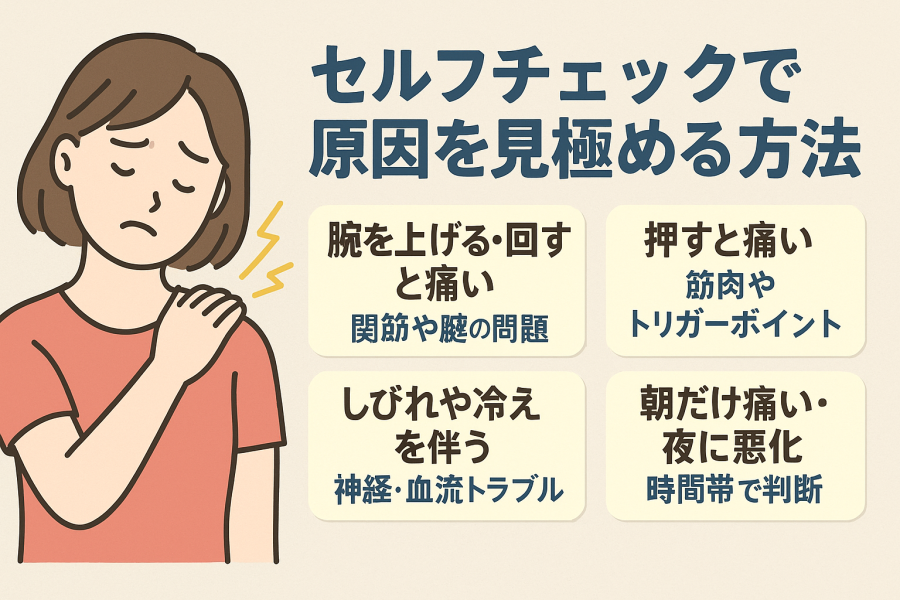 腕の付け根は“筋肉・腱・神経・関節”が交差する複雑な場所です。痛みの場所と出方を意識することで、原因に近づくことができます。「どこが、どう痛いか?」を言葉にできると、セルフケアや病院での説明にも役立ちます。