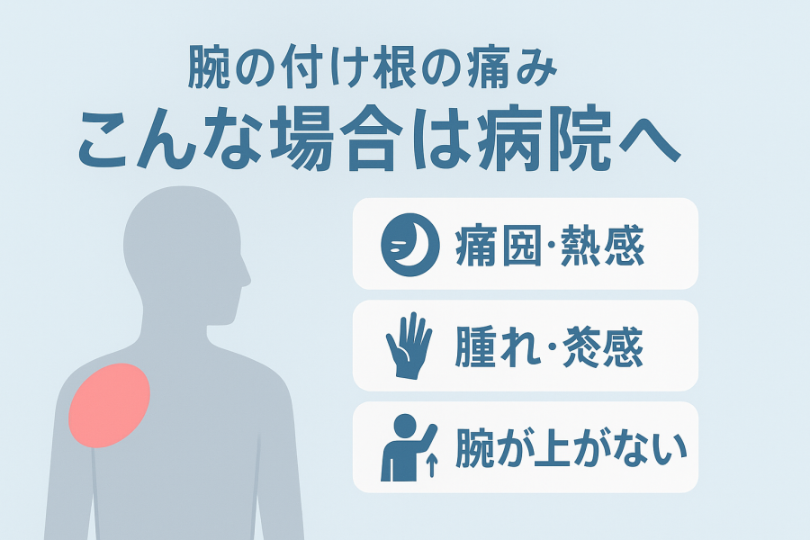 腕の付け根の痛みは、日常の使いすぎや姿勢の乱れから起こることも多いのですが、なかには早めに病院へ相談したほうが良いケースもあります。ここでは、よく挙げられている“危険サイン”と、整形外科などで行われる触診・検査の流れをまとめておきます。「どこまで様子を見て良いのか迷う…」という方の参考になると思います。