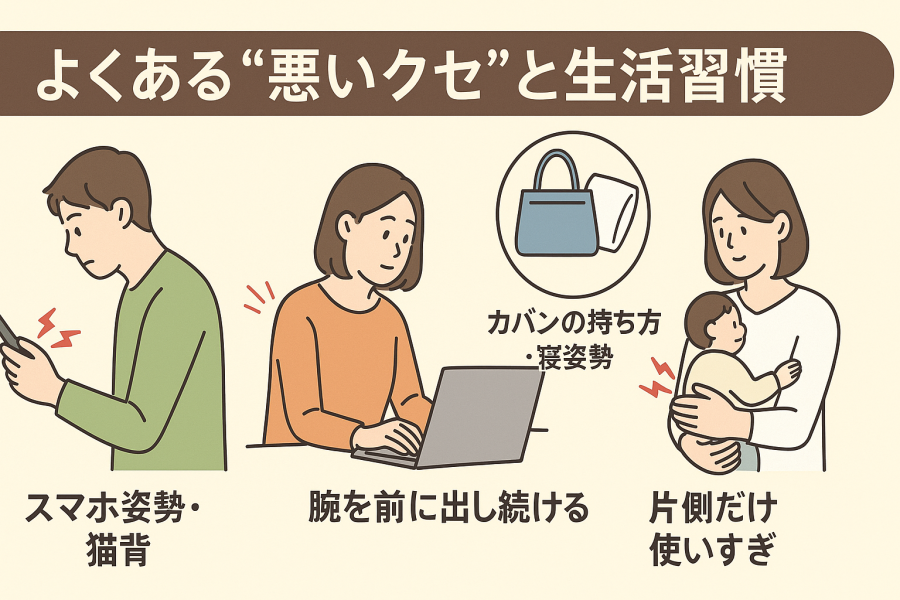 知人が「長時間スマホを操作していただけで腕の付け根が重だるい」と言っていたことがありますが、まさに姿勢のクセによる負担の典型と言えるかもしれません。