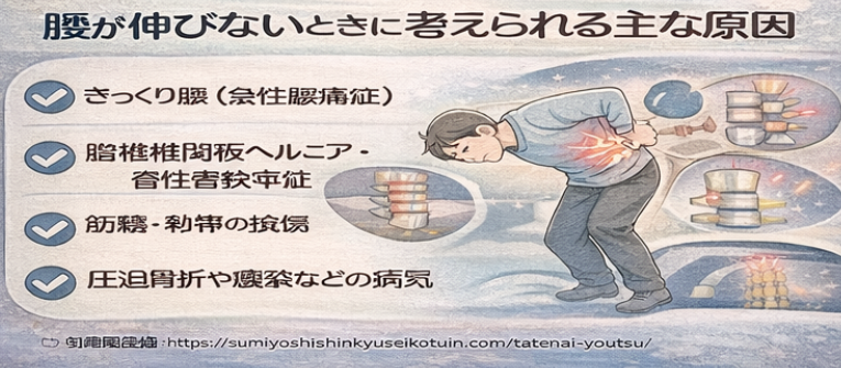 一方で、腰が伸びないだけでなく、脚のしびれや痛み、力の入りにくさがある場合は、椎間板ヘルニアや脊柱管狭窄症なども考えたいです。こうした病気では、神経が刺激されることで、腰だけでなくお尻や太もも、ふくらはぎまで症状が広がることがあります。単なる筋肉痛の延長と考えないほうがよいケースですね。