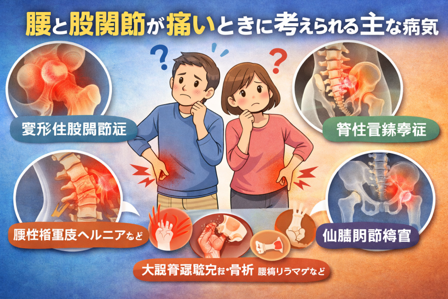 「腰と股関節が同時に痛いときって、結局どこが悪いの?」と迷いますよね。実際、この組み合わせの痛みでは、股関節そのものの問題だけでなく、腰の神経や骨盤まわりの影響が重なっていることもあると言われています。たとえば、立ち上がりや歩き始めで足の付け根が痛む場合は変形性股関節症、腰からお尻、太ももへ広がるような痛みやしびれがある場合は腰椎椎間板ヘルニアや坐骨神経痛、歩くとつらくて少し休むと楽になる場合は腰部脊柱管狭窄症が関係していることがあるそうです。また、腰とお尻の境目や股関節の付け根あたりがつらく、寝返りや立ち上がりで痛みやすい場合は仙腸関節障害も候補になると言われています。さらに、急に強い股関節痛が出る大腿骨頭壊死症や、転倒後の骨折、炎症が続く関節リウマチなど、見逃したくない病気が隠れている場合もあるようです。だからこそ、「腰痛っぽいから様子見でいいかな」と決めつけず、痛む場所、動いたときの変化、しびれや歩きづらさの有無まで一緒に見ていくことが大切と言われています。