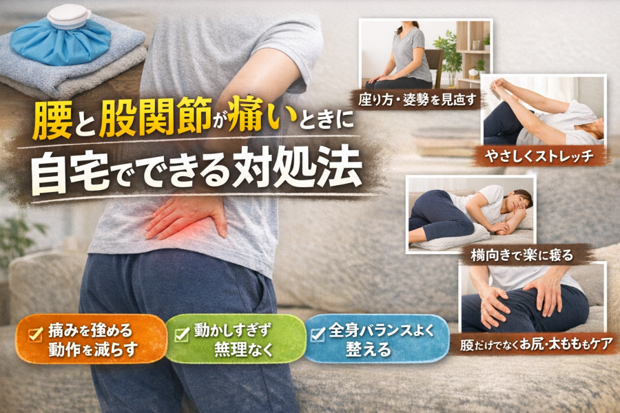 「腰と股関節が痛いとき、自宅では何をしたらいいの?」と迷いますよね。まず大切なのは、痛みを強めやすい動きをいったん減らしつつ、まったく動かさない状態にはしすぎないことだと言われています。深くしゃがむ、勢いよくひねる、長時間同じ姿勢を続ける、といった動作は負担になりやすい一方で、無理のない範囲で体勢を変えたり、短い時間でもこまめに動いたりするほうが楽になるケースもあるようです。加えて、腰だけ、股関節だけと部分で見すぎないこともポイントとされています。股関節の痛みでは姿勢のくずれや骨盤まわりの使い方が関係し、腰の不快感でもお尻や太もものかたさが影響することがあるためです。座り方、立ち方、寝方を少し見直すだけでも、日常の負担が変わることがあると言われています。また、セルフケアをするときは、強く伸ばしすぎず、呼吸を止めず、痛みを我慢しないことが前提とされています。とくに長引く痛みがあるときほど、「とにかく腰だけ揉めばいい」と考えず、骨盤・お尻・太ももまで含めてやさしく整える視点が大切と言われています。