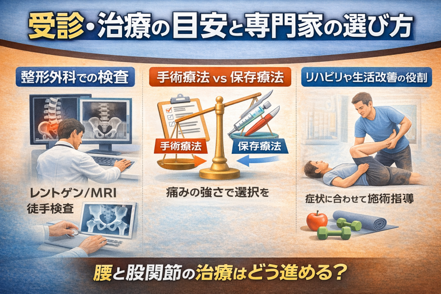 検査で大きな異常が見つからない場合でも、理学療法やリハビリ、生活習慣の見直しが重要になることがあります。体の使い方や負担のかかり方を整理し、無理のない範囲で動きを整えていくことで、腰と股関節の負担軽減につながる可能性があると言われています。医療機関と施術院、それぞれの役割を理解して選ぶことが安心材料になると考えられています。