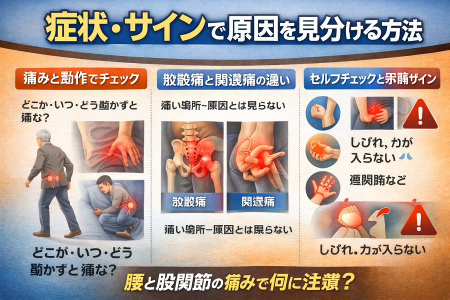 家で見るなら、①歩幅が小さくなる ②靴下をはく動作で股関節がつっぱる ③片足に体重を乗せると怖い、などを確認してみてください。加えて、しびれが強い/力が入りにくい/夜間痛が非常に強い/急に悪化したといった“赤旗”のときは、早めに医療機関へ来院して検査で状況を確認するのが安心だと言われています。