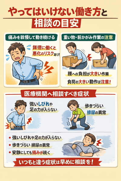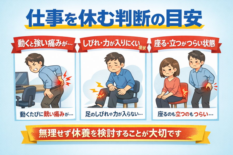 では、どんな状態なら注意したいのでしょうか。たとえば、座るだけでつらい、立ち上がりで痛みが強い、歩くたびに腰や足に響く、こうした状態では仕事の負担が大きくなりやすいと言われています。腰痛の総説でも、神経症状を伴う腰痛や、日常動作に支障が出る腰痛は見極めが重要とされています。くまのみ整骨院でも、激しい痛みやしびれなどの神経症状がある場合は、無理に仕事を続けない判断が必要と案内されています。腰椎椎間板症 仕事 休むと検索する方ほど、「働けるか」だけでなく、「普段の生活まで無理が出ていないか」を一緒に見たほうがよいと言われています。