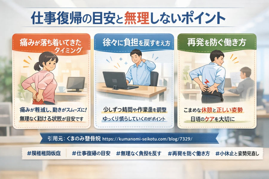 「そろそろ仕事に戻ってもいいのかな」と迷う時期、ありますよね。腰椎椎間板症で仕事復帰を考えるときは、痛みがゼロかどうかだけでなく、日常の動きが少しずつ安定してきたかを見ることが大切と言われています。たとえば、起き上がりや歩行で強い痛みが出にくくなった、座る・立つ動作が前よりスムーズになった、こうした変化は一つの目安になりやすいようです。くまのみ整骨院でも、腰痛で仕事を休むかどうかは痛みの強さだけでなく、動きの制限やしびれの有無も含めて考えることが大切と案内されています。さらに、厚生労働省の腰痛予防資料でも、腰痛の既往がある方は小休止や休息を取りながら再発や悪化を防ぐ必要があると示されています。ですので、復帰のタイミングも「無理なく動けるか」を基準に考えることが大切と言われています。