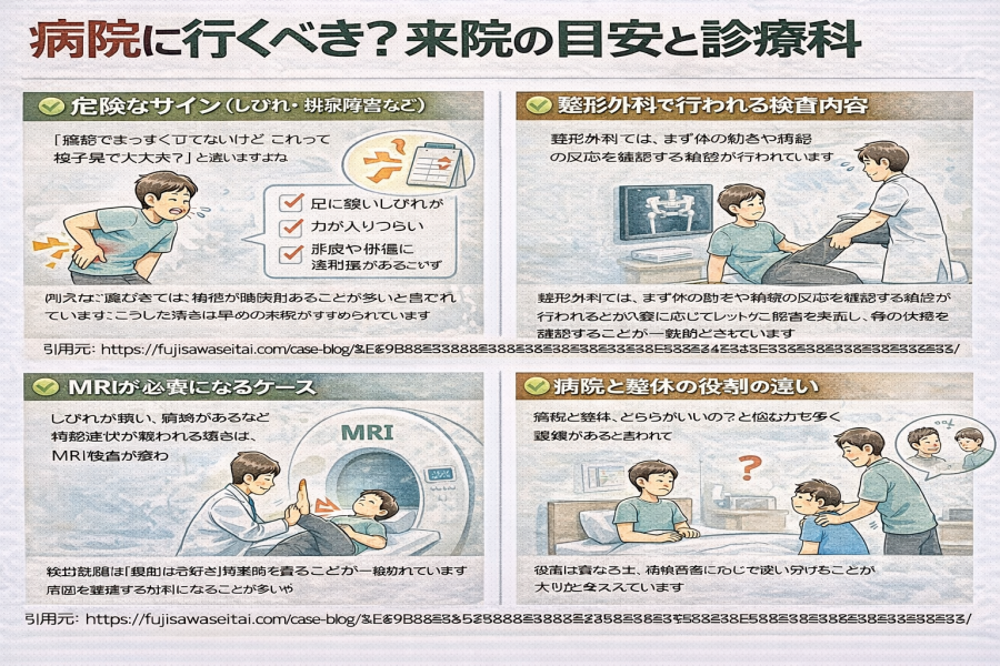 「足までしびれてきたんですけど…」という場合は注意が必要です。椎間板ヘルニアでは、神経が圧迫されることで腰だけでなく脚にもしびれや痛みが出ることがあると言われています。ただし、腰が伸びない=必ずヘルニアというわけではないとされています。症状の広がり方が判断材料になるようです。
