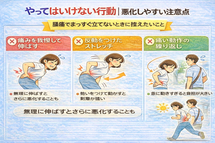 そう思う気持ちは自然ですが、やり方次第では回復を遠ざけてしまうこともあると言われています。ここでは、腰痛でまっすぐ立てないときに避けたい行動を整理します。