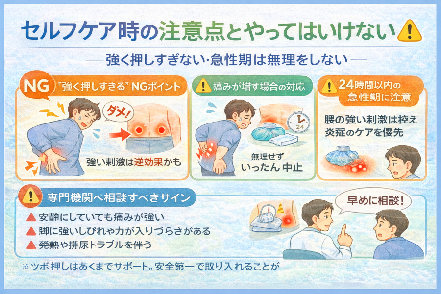 ただし、しびれや力が入りづらい症状がある場合は、自己判断を続けず専門家に相談することが大切です。症状別に押すポイントを変えることが、腰痛セルフケアの基本と紹介されています。
