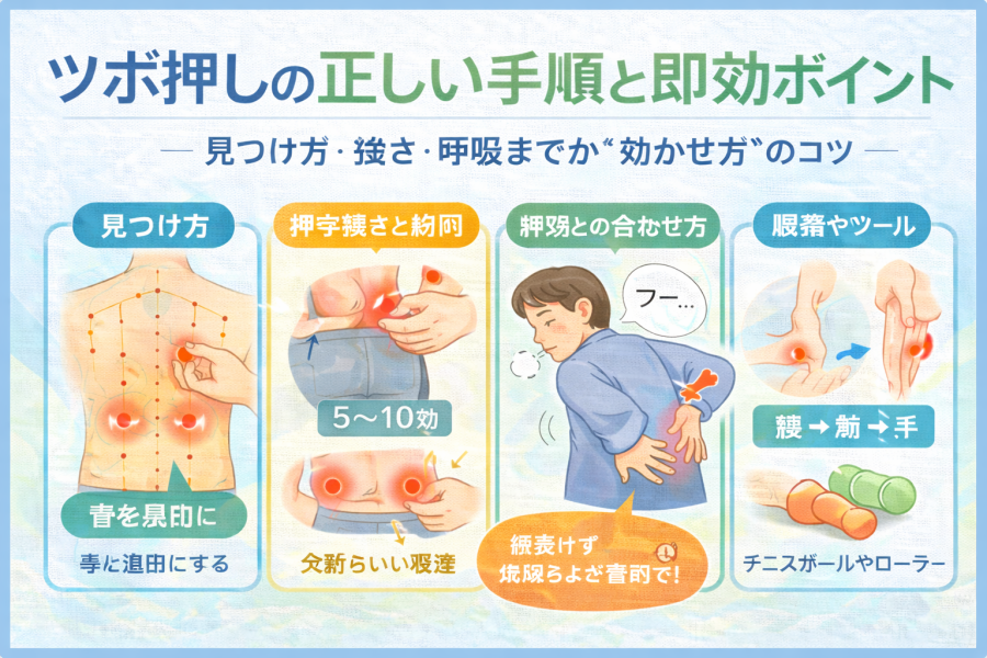 まず見つけ方。基本は“骨を目印にする”こと。背骨や膝裏のくぼみ、足首の出っぱりなど、触ってわかるランドマークを基準に探すと位置が安定しやすいと紹介されています。指先で軽くなぞり、「少し響く」「重だるい」感覚があれば目安になることがあるそうです。