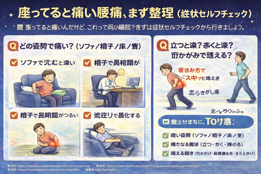 「腰 座ってると痛いんだけど、これって何が原因?」——まずは“どんな座り方でつらくなるか”を整理すると、対策が選びやすいと言われています。難しい検査の前に、今日できるセルフチェックからいきましょう。