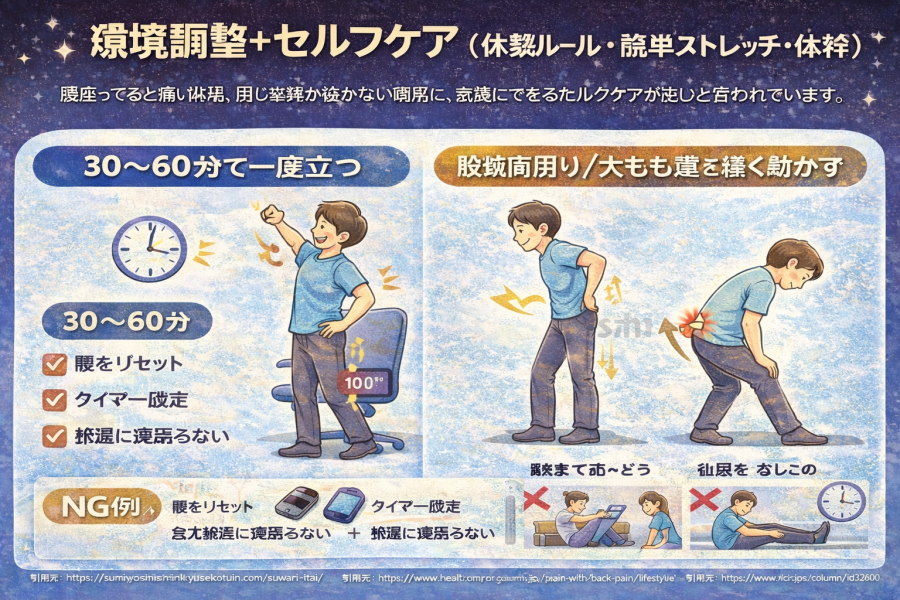 ここでのコツは“ストレッチを頑張る”より、こまめに姿勢を変えること。30〜60分に一度立つ、数分歩く、座り直す——こういう小さなリセットが現実的だと言われています。