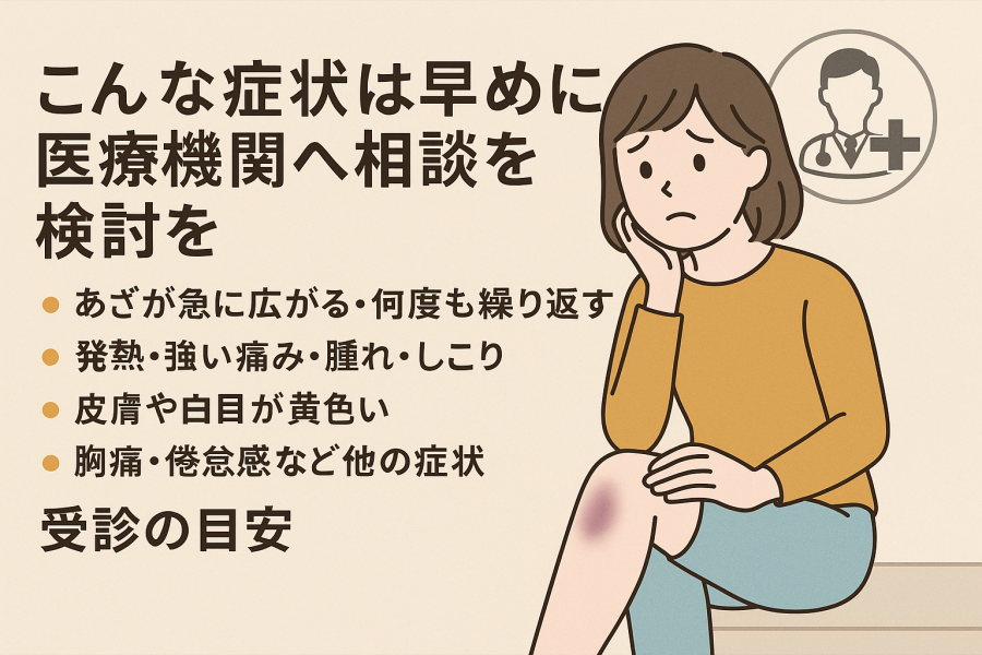 あざだけでなく、発熱・強い痛み・大きな腫れ・しこりを伴うケースは、一般的に注意が必要とされています。