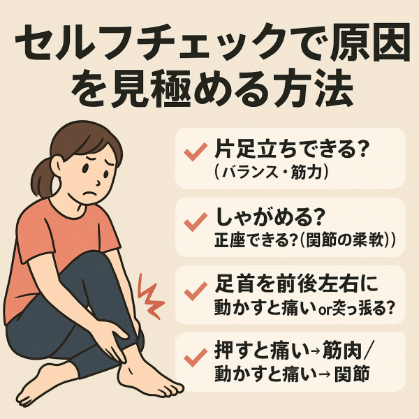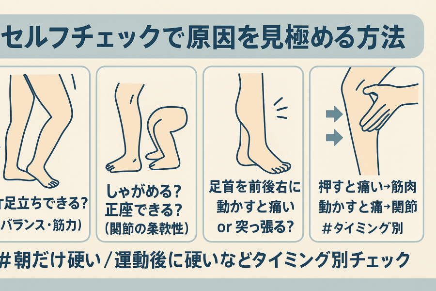 「足が硬い」と感じるとき、その原因が筋肉・関節・姿勢のどれにあるのかを知ることが、改善の第一歩と言われています。ここでは、自宅でも簡単にできるセルフチェック方法を紹介します。
