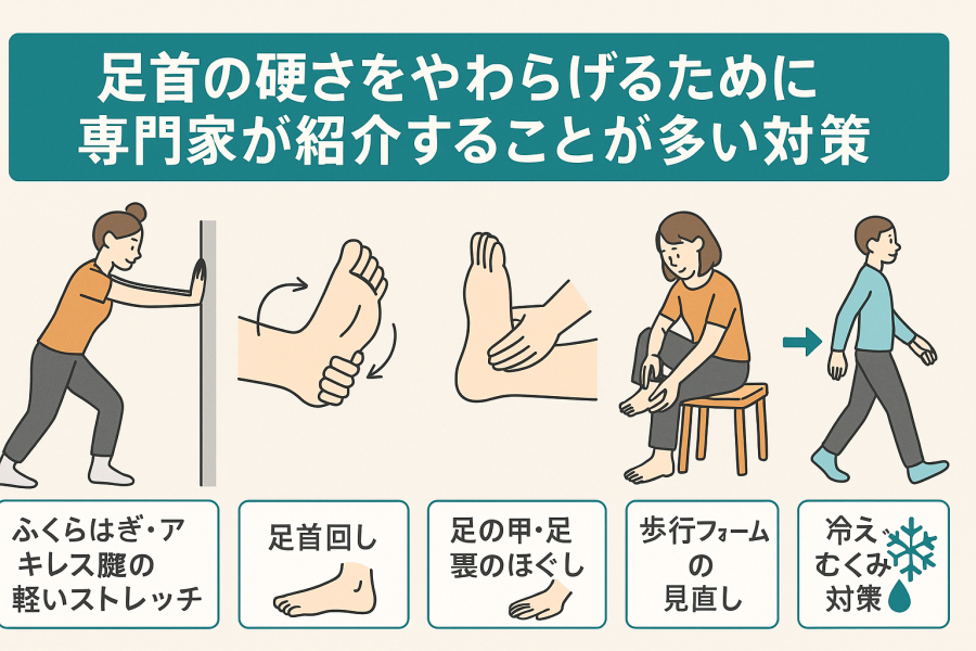 ふくらはぎのストレッチ、足首回し、足裏ほぐし、歩行フォームの改善、冷えやむくみ対策などは、専門家が“参考として紹介することが多い方法”です。