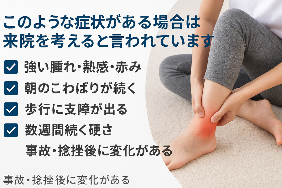 強い腫れ・熱感、朝のこわばりが続く、歩行の支障、数週間続く硬さ、ケガ後の違和感などは、上位ページでも“来院を検討する判断材料として紹介されています”。