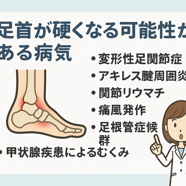 足首が硬くなる背景には、変形性足関節症・アキレス腱周囲炎・関節リウマチ・痛風発作・足根管症候群・甲状腺関連のむくみなど、さまざまな病気が“例として挙げられています”。