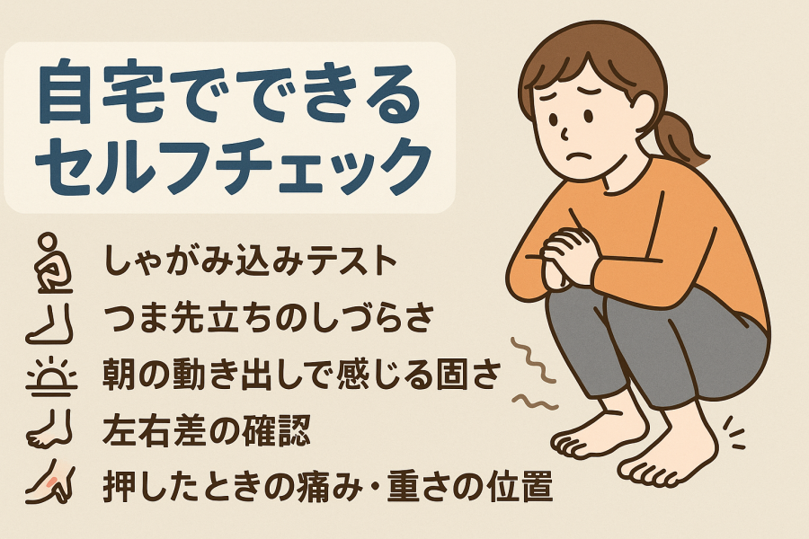 足首の硬さは、しゃがみ込み・つま先立ち・朝のこわばり・左右差・押したときの感じ方など、日常の動きで状態を整理できると言われています。